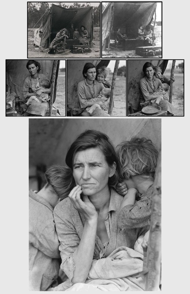 La Lange scatta 6 foto, avvicinandosi sempre più ai soggetti cercando la giusta composizione per raccontare la storia. Il secondo fotogramma raramente menzionato dalla Lange, è probabilmente il primo scatto, successivamente La Lange mette in posa i soggetti fino ad arrivare alla foto iconica che conosciamo