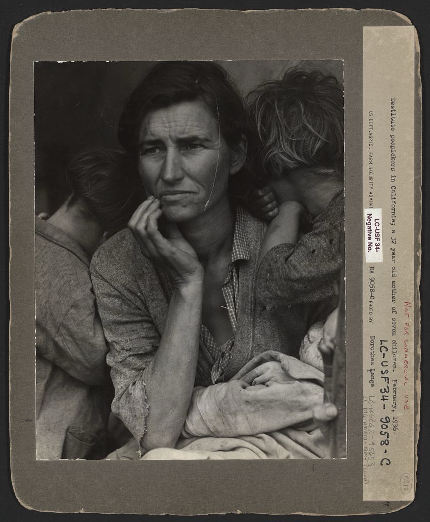 Fu scattata dalla Lange a Nipomo, nell’Imperial Valley, nei primi giorni di marzo del ‘36: la fotografa stava transitando con la sua auto nei pressi di un campo che ospitava oltre duemila braccianti impiegati nella raccolta dei piselli precoci. Appena fuori dal campo, in una tenda improvvisata sul bordo della strada, la Lange nota una donna con alcuni bambini; riprende la scena da lontano, poi si avvicina e dopo aver scambiato qualche parola con lei scatta ancora quattro foto